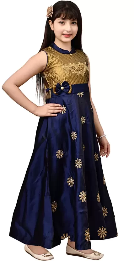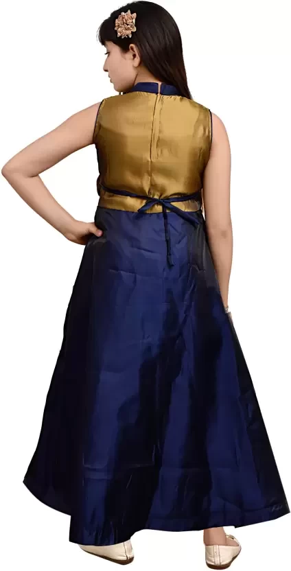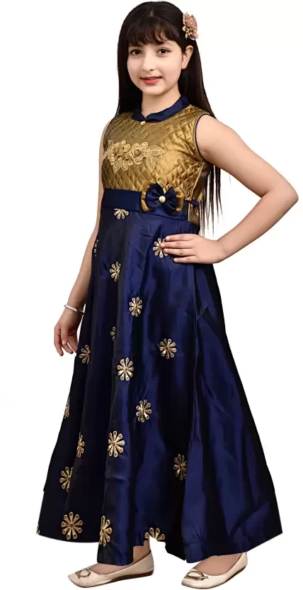 Girl's Silk Satin Embroidery Work Long Gown Dress ( Blue )