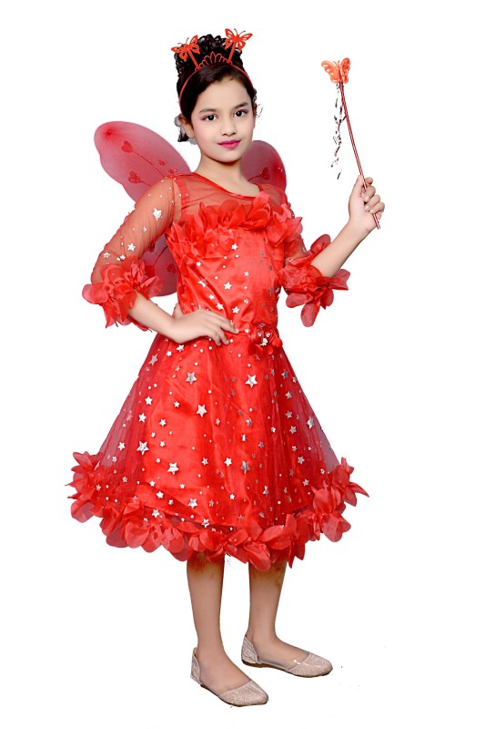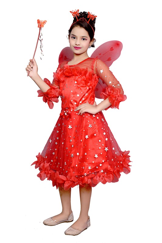 Girl's Star Print Knee Length Angel Frocks Inside Of Pack Wings , Stick And Hairband Pack Of 1 ( Red )